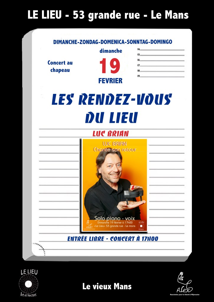 Le 19 février prochain à 17h00 ce sera un autre style et un autre univers avec un récital Piano-Voix de Luc Brian. Notez le, une fois par mois l’après-midi dominical est musical au « Lieu »