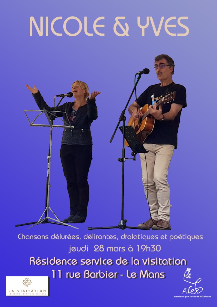 Ne manquez pas Nicole et Yves Jeudi c’est en plus un belle occasion de découvrir ce lieu accueillant du mans et de faire connaissance avec toute une équipe dévouée et particulièrement sympathique. C’est à 19h30 et c’est ouvert à tous les publics. Soirée au chapeau.