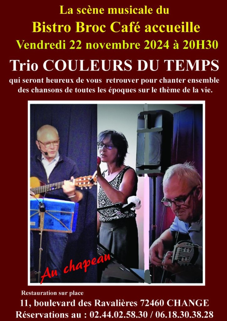 Le trio Couleur du temps qu’il n’est plus utile de présenter sera le 22 novembre au Broc Café.