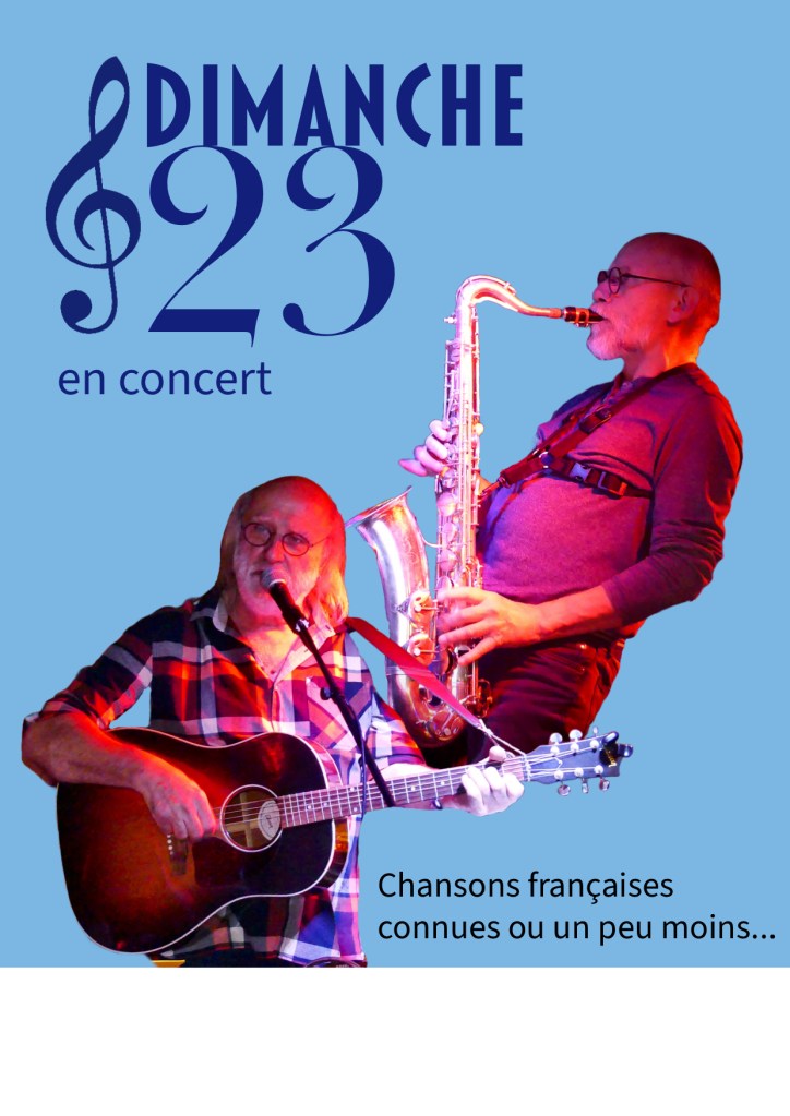On ne les présente plus, célèbre de Sablé sur Sarthe à Roupérroux-le -Coquet, le duo « Dimanche 23 » sera le 24 janvier à 20h30 au « Broc Café à Changé. C’est toujours un plaisir de revisiter leur répertoire qui fait vivre des chansons françaises connues ou un peu moins…..