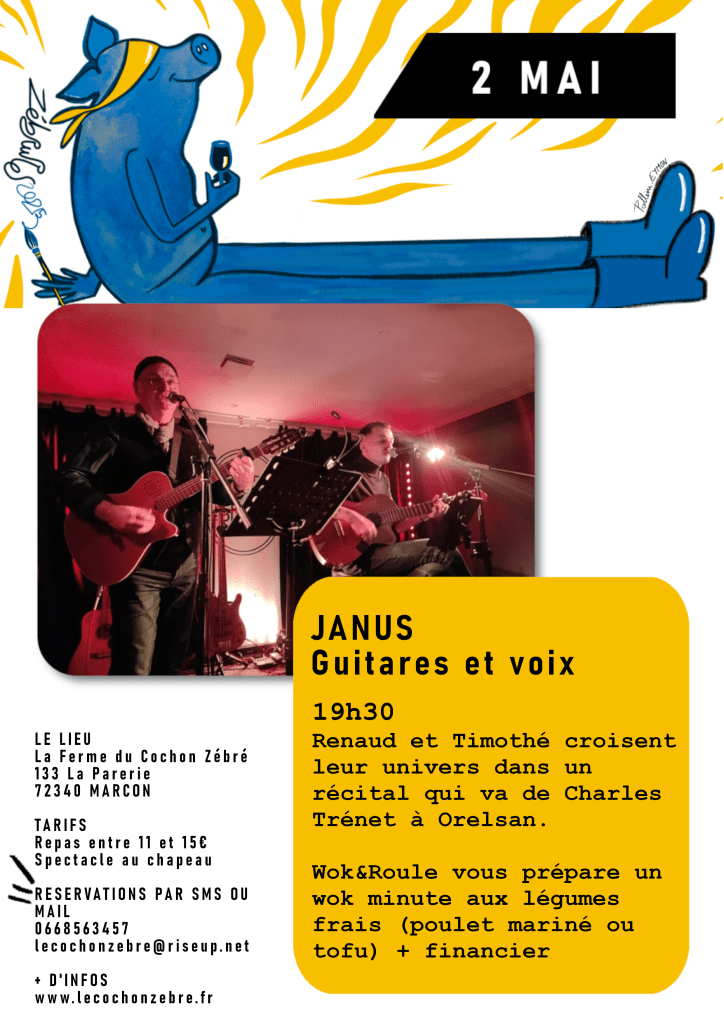 A la ferme du Cochon zébré à Marçon Maude s’active pour proposer toute l’année des activités culturelles et des spectacles. C’est vraiment un grand plaisir d’être intégré à cette programmation. Ce sera le 2 mai à 19h30. Le lieu : La ferme du cochon zébré – 133 la Parerie – 72340 Marçon. Réservation par SMS ou mail 06 68 56 34 57 ou lecochonzebre@riseup.net Plus d’infos sur http://www.lecochon zebre.fr