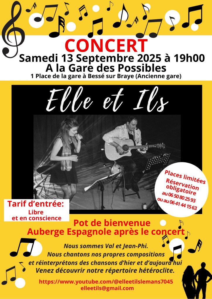 Le 13 septembre Elle et ILS seront en concert à Bessé sur Braye. C’est à 19h à l’ancienne gare. Pour tous les détails voir l’affiche.