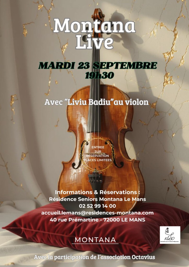Très beau concert en perspective le 23 septembre à 19h30 à la résidence service Montana (40 rue Prémartine au Mans) avec le violoniste Liviu Badiu qui nous avait enchanté il y a trois ans lors d’un concert au « Lieu ». Ne manquez pas ce superbe voyage au pays du violon. Attention il est prudent de réserver au 02 52 99 14 00 ou par mail : accueil.lemans@residences-montana.com