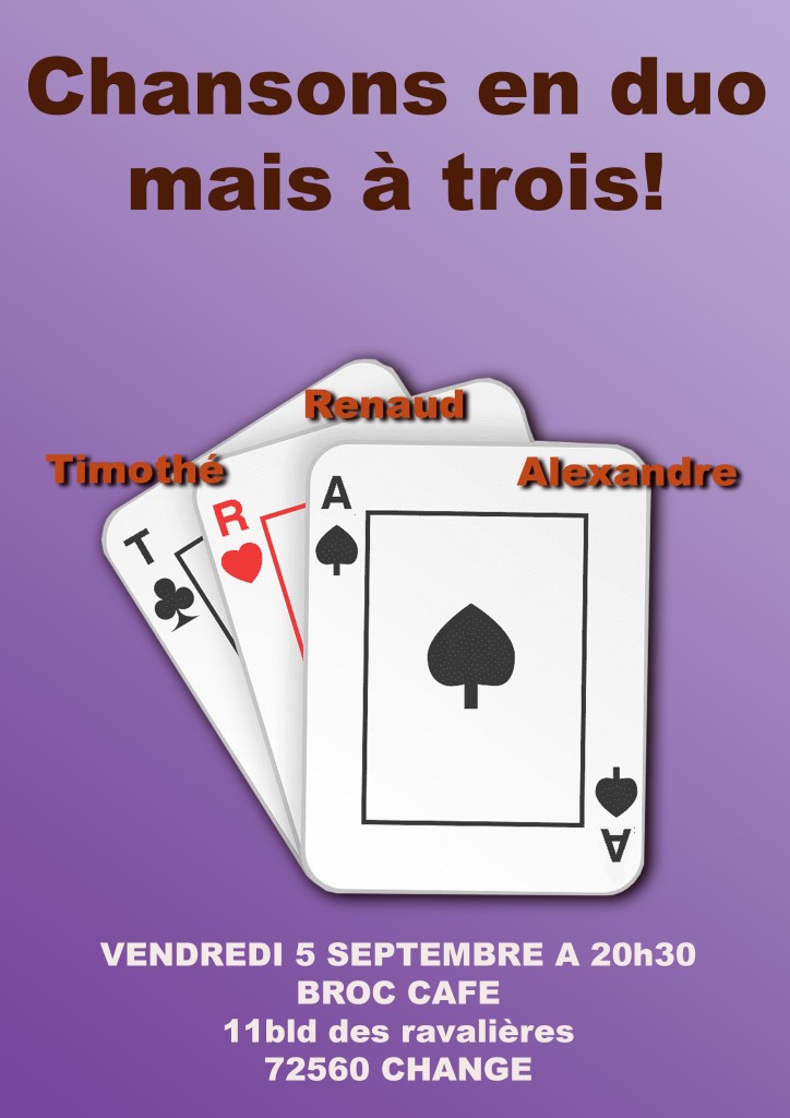 Le 5 septembre prochain au Broc Café nous ferons un concert en deux parties: une première partie Timothé/Renaud et une seconde partie Alexandre/Timothé. Bref, deux duos mais à trois. Si vous avez envie de taper des mains, des pieds ou plus si affinité, on vous attends!