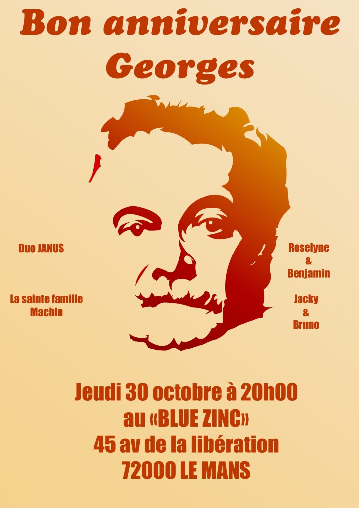 Après la belle prestation au « Broc Café », toute l’équipe se retrouve le 30 octobre à 20h au BLUE ZINC pour fêter le grand Georges et son répertoire unique.